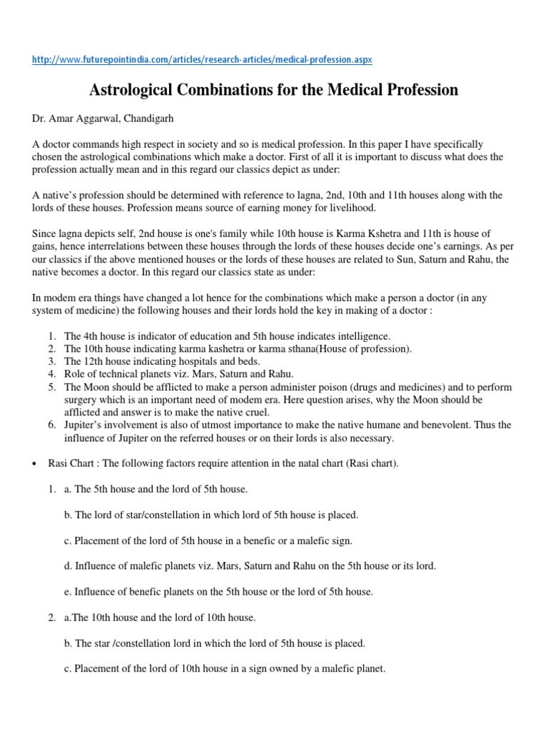Astrological Combinations Required For A Medical Profession Sep 6, 2019 ... For surgeons, Mars plays an important role, and for a doctor of medicine, Venus plays an important role. Apart from these planets, Sun, Jupiter ... Lifestyle | Daily Life | News | The Sydney Morning Herald The latest Lifestyle | Daily Life news, tips, opinion and advice from The Sydney Morning Herald covering life and relationships, beauty, fashion, health & wellbeing Medical Profession and Astrological Combinations Go A Long Way!! Oct 8, 2020 ... Sun and Jupiter are the planets that play a crucial role for those who want to pursue a medical-related profession as their career. Jupiter is ...