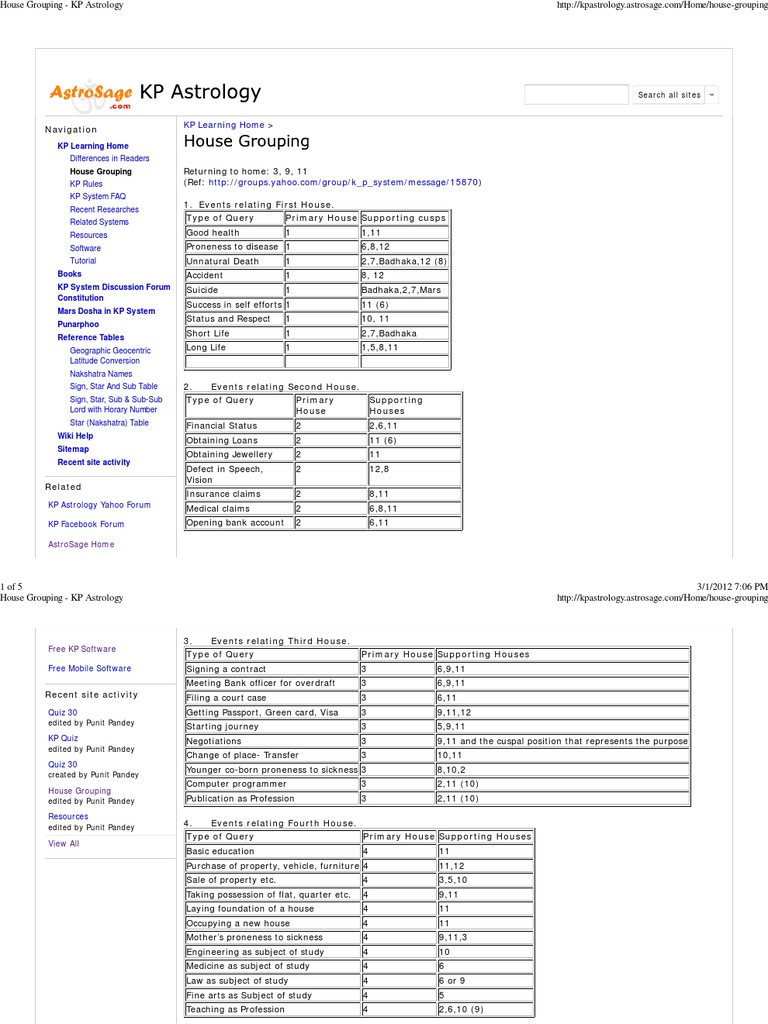 KP Astrology Overview - Krishnamurthy Paddhati - Jothishi KP House Groups. The KP system also uses sets or groups of houses that influence a particular aspect of life. This is a method that is also used in other systems of astrology. Some KP groups are: Marriage 2, 7, 11. Gain of money 2, 6, 11. Life Span 1, 8, 3. Childbirth 2, 5, 11. Cure from disease 1, 5, 11. Education 4, 9, 11. Foreign travel 3, 9, 12 KP Astrology PDF | PDF - Scribd KP ASTROLOGY PPT PDF.pdf - Free download as PDF File (.pdf), Text File (.txt) or view presentation slides online. ... For example - House 5 is 12th to 6th so negation of job house. combination of 5,6,11, means job promise with negation. Solution would be occupying 5th house.