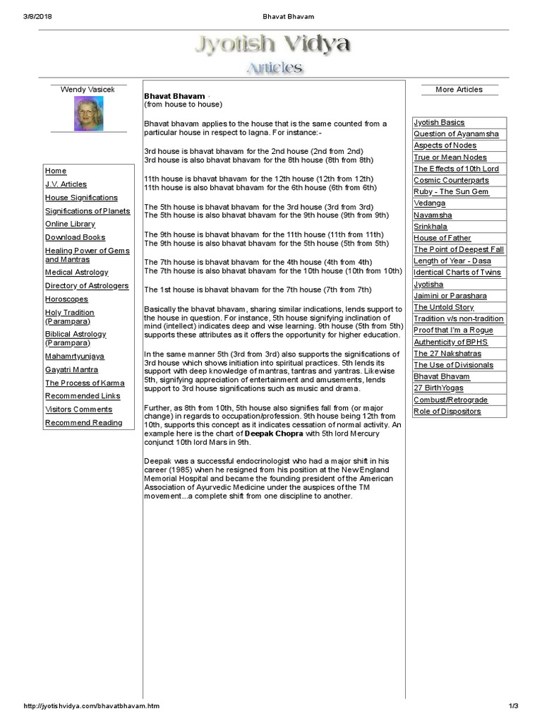 #9 Bhavat Bhavam - Divination - Astrology, Tarot, Oracle….. Well, this is a concept in Astrology called as Bhavat Bhavam. Lets start with an example. Supposing you are seeing an astrological reading for children of a person from the person's chart. Then to see the person's children you refer his 5th house. Right ? (#6 Houses - Part 2 (Houses 5-8)) But for children you also see 9th house, WHY ??? Page 2 | bhavat bhavam in trigger transits - astrology-videos.com Relocational Astrology; Understanding the 5 Elements; Intermediate Courses. Lajjitaadi Avasthas Master's Course; Healing Rahu & Ketu; ... bhavat bhavam in trigger transits. Page 2 / 2 Prev . Transits. Last Post by David108 3 months ago 12 Posts. 2 ... Bhavat Bhavam Concept: An... - Worldwide Vedic Astrology Bhavam (भवम) = that will be / that will happen (future part). Thus, Bhavat Bhavam would mean “Another house from the select house” that would be akin to the ... Secrets of bhavat-bhavam - Vidyavaridhi Jyothish The concept of bhavat-bhavam means that from the bhava in question, it is the future bhava. Bhavat means future. So it is as if the bhava is born again in the future. Translated to English it can mean as "from house to house". This is a great little technique when making predictions about a particular bhava in astrology. The results are as ...