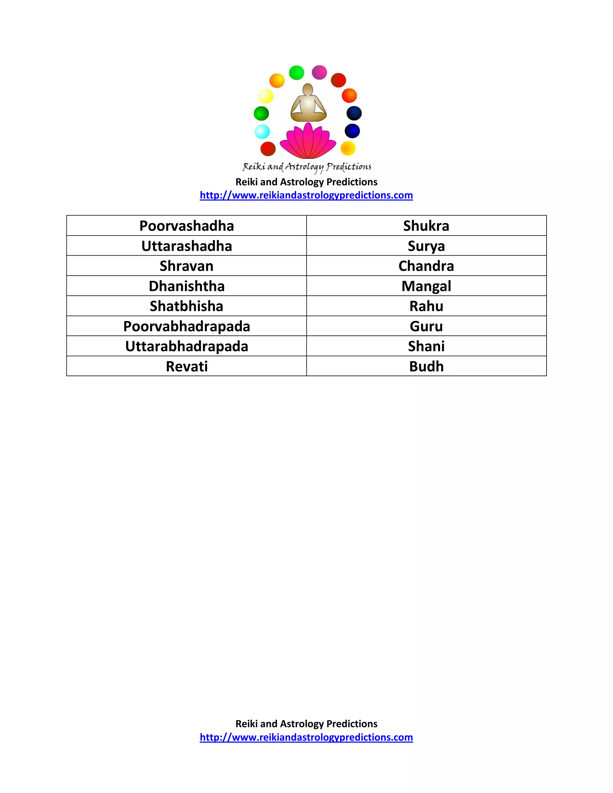 Nakshatras in Hindu Astrology: 27 Nakshatras and Their Lords 27 Nakshatras and Their Lords 1. KETU: Ashwini, Magha and Moola 2. SHUKRA or VENUS: Bharni, Poorva-Falguni and Poorva-Shadha 3. SURYA or SUN: Kritika, Uttara-Falguni and Uttara-Shadha 4. CHANDRA or MOON: Rohini, Hast and Shravana 5. MANGAL or MARS: Mrigshira, Chitra and Dhanishtha 6. RAHU: Aardra, Swati and Shatbhisha 7.